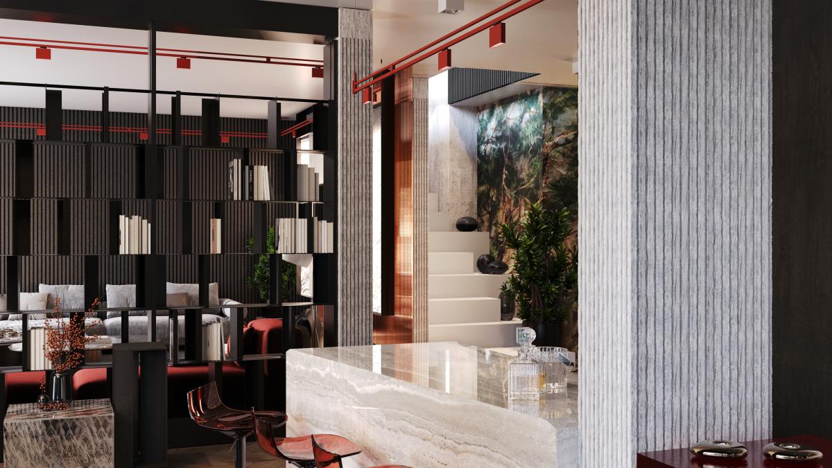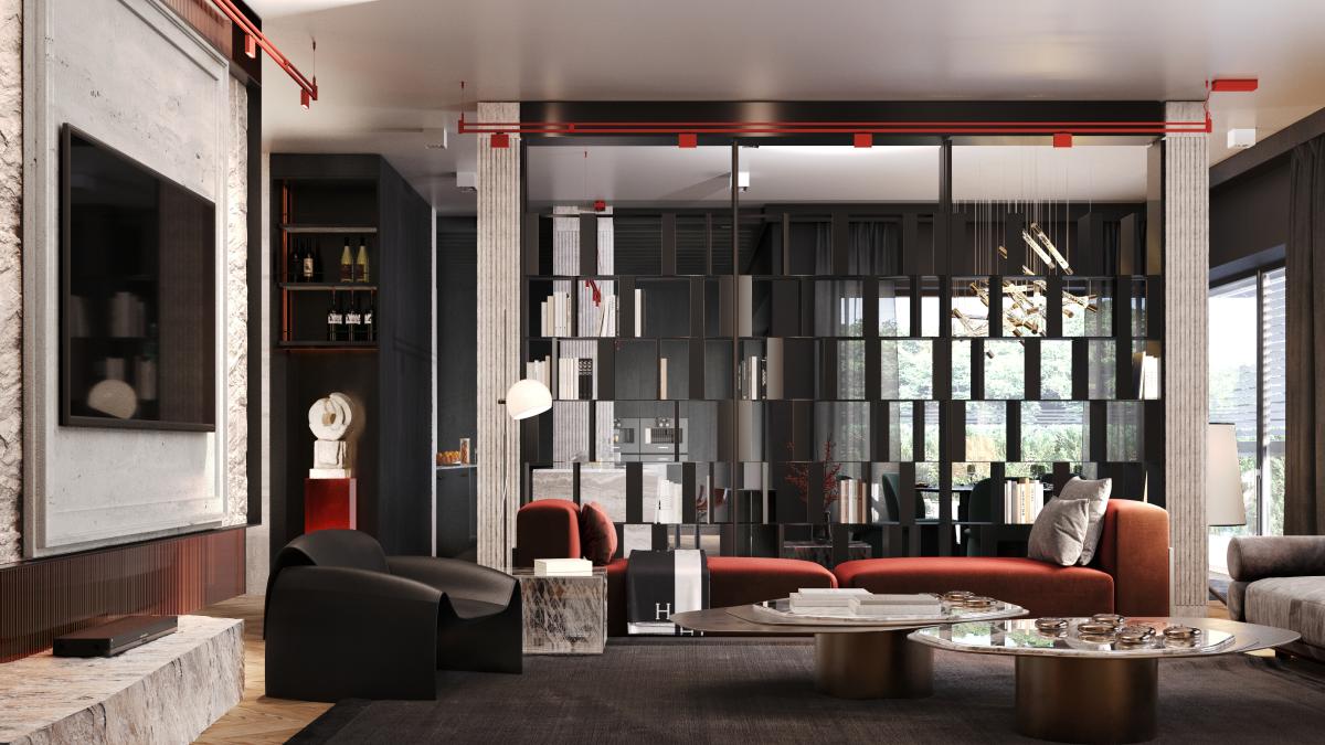 The interior style was inspired by the combination of natural and heavy materials, such as dark wood, stone, and travertine. These were combined with a simple form which gives us an exceptionally elegant interior. Additionally, this space was broken up with sophisticated accessories and the use of one strong color in the form of accents. Despite strong materials, it creates a harmonious and atmospheric interior.
