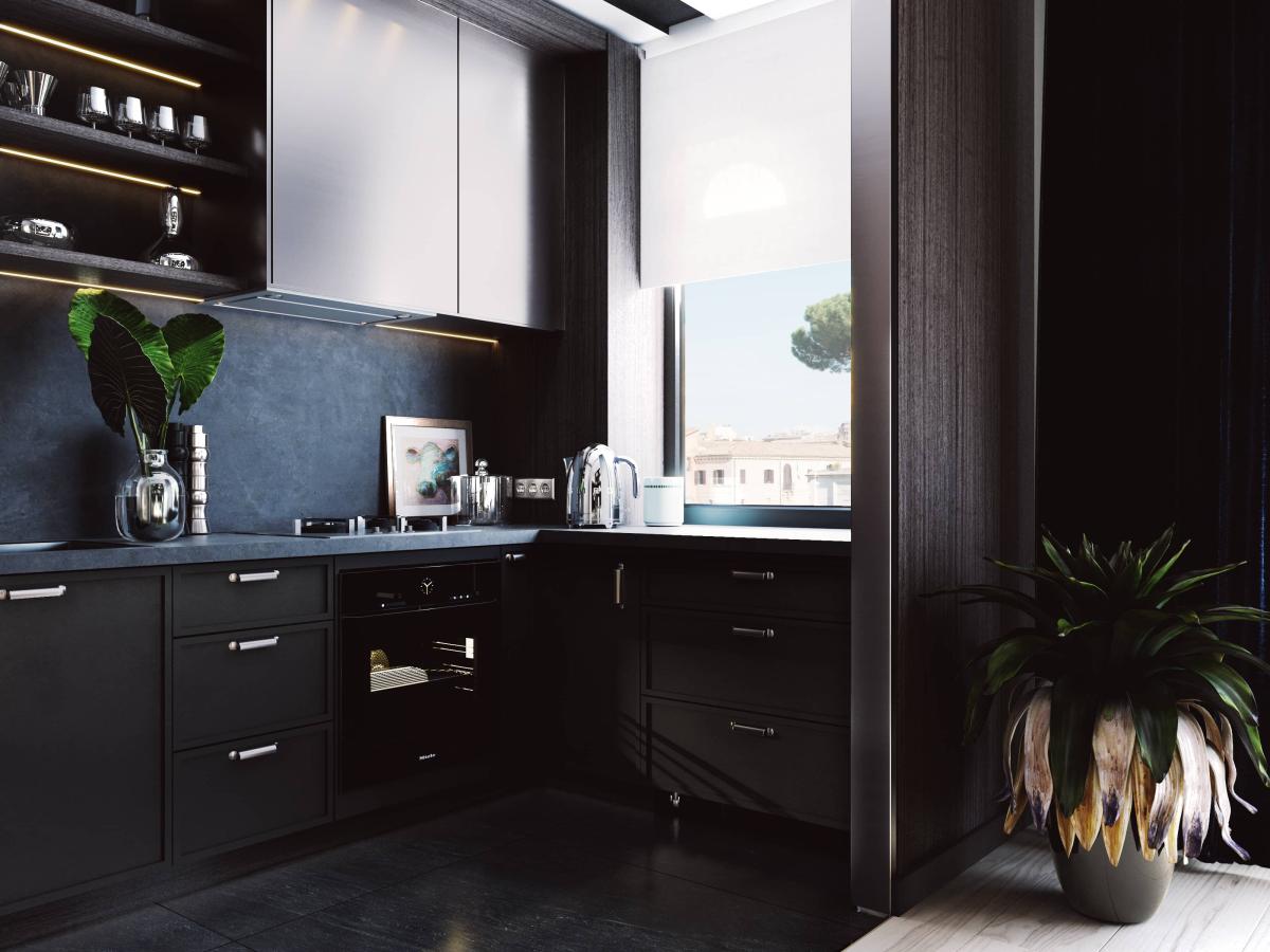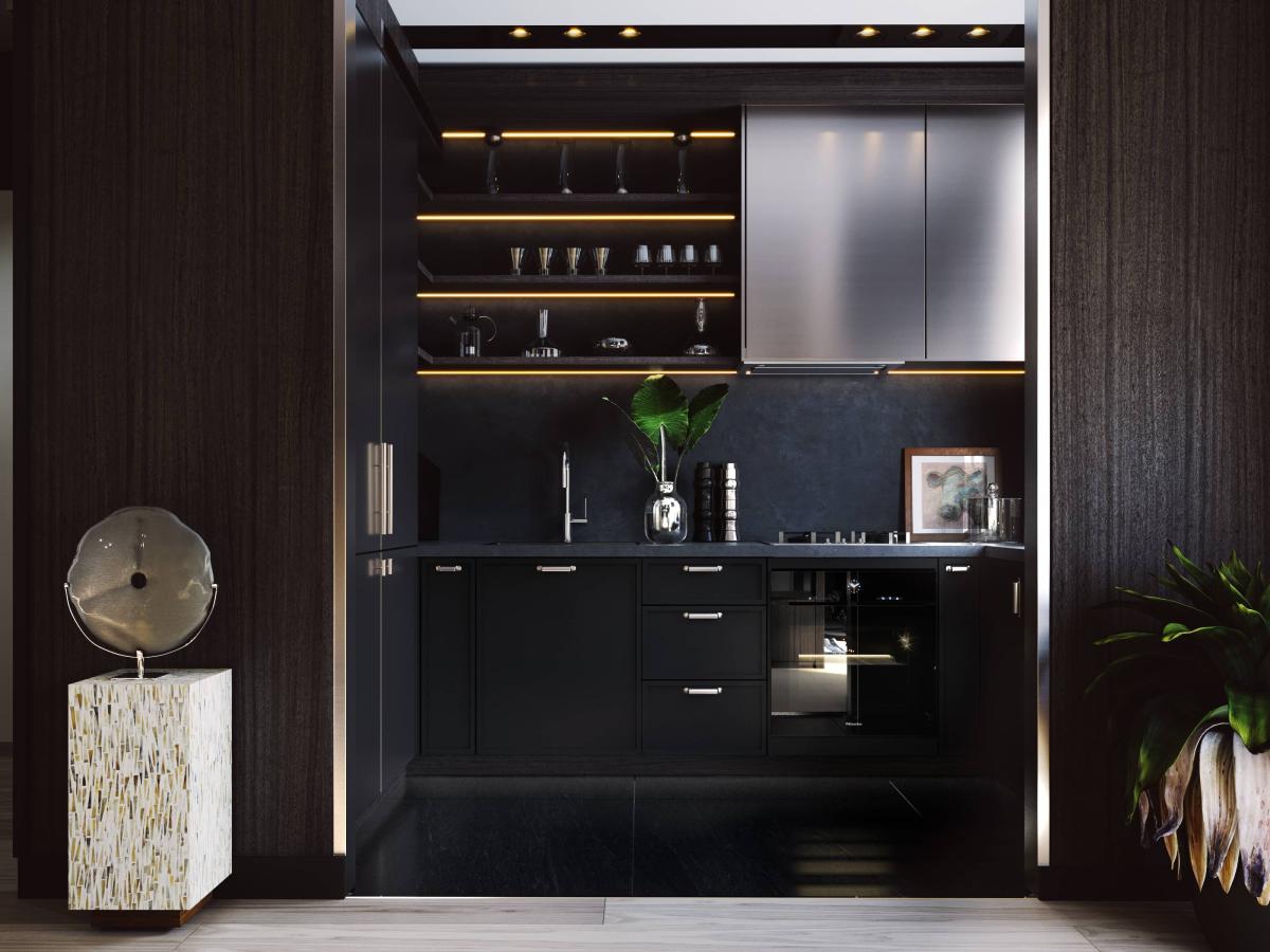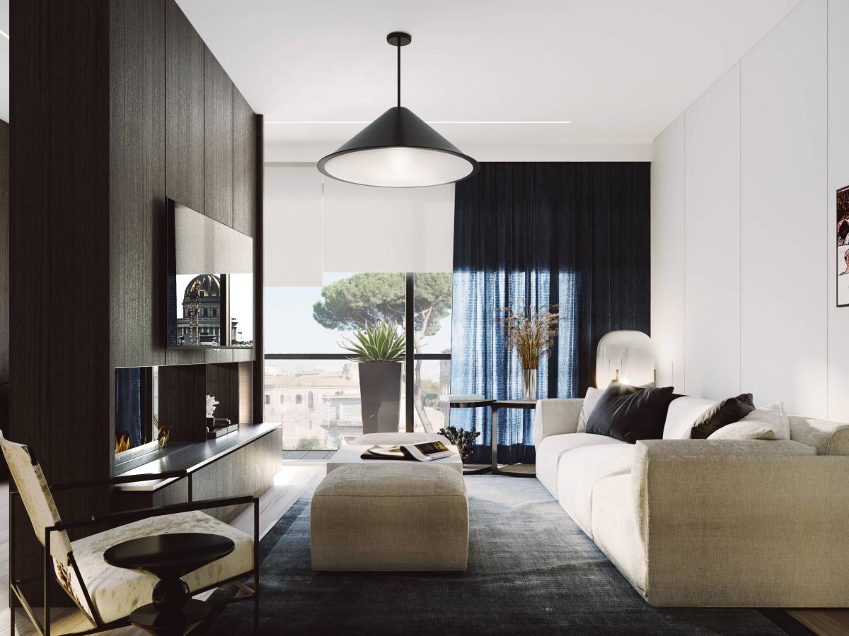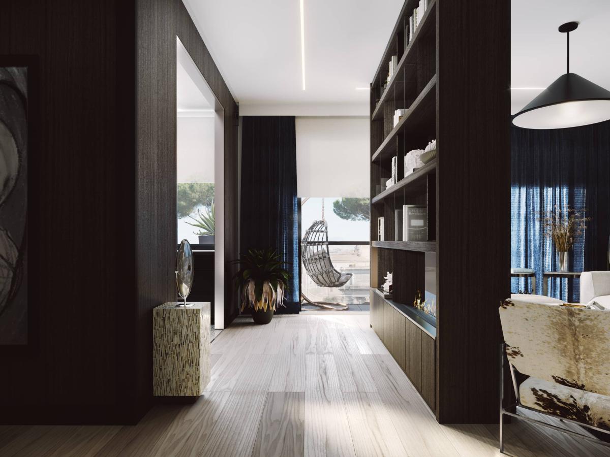 Apartament oferuje przestronny salon z nowoczesną kuchnią, przytulną jadalnię, komfortową sypialnię oraz elegancką łazienkę. Wnętrze urzeka prostotą i ponadczasową elegancją, dzięki harmonijnemu połączeniu ciemnego forniru z jasnymi ścianami i stylowym wyposażeniem.