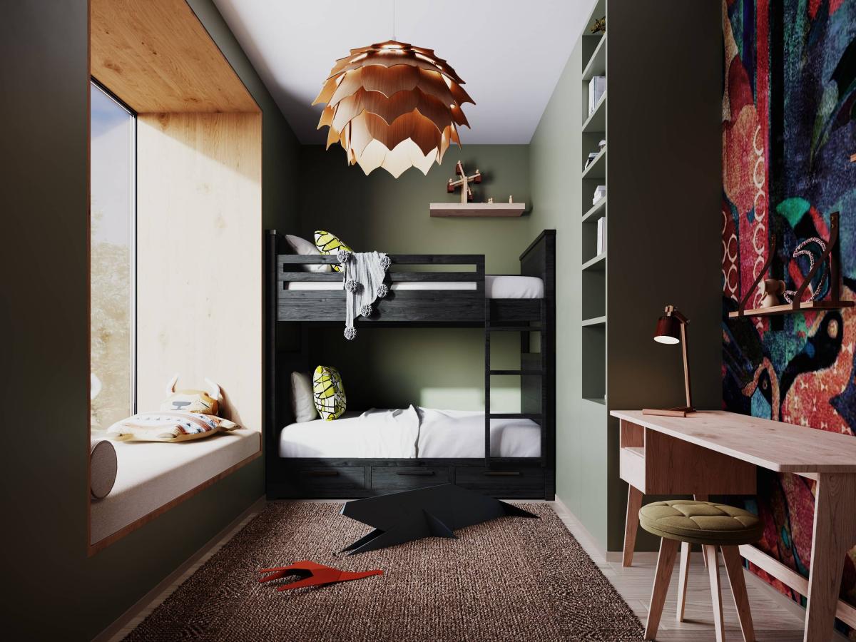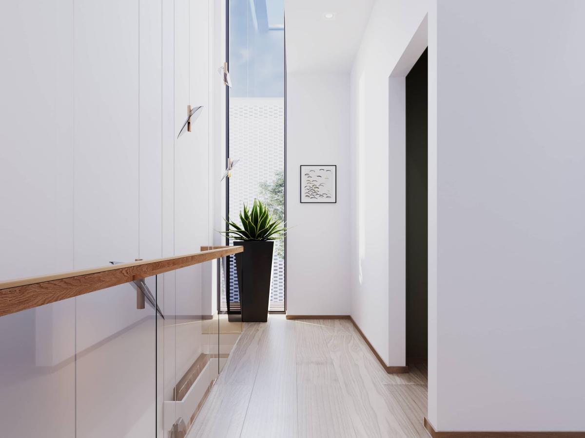 Parter domu jest zarezerwowany na części wspólne, wyższe piętro posiada pokoje dla dzieci, sypialnię oraz wspólną łazienkę. Ostatnie piętro posiada część wspólną przygotowaną na miejsce do pracy w domu oraz pokój gościnny.