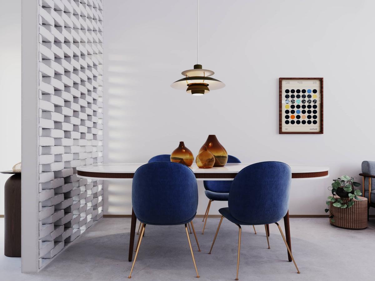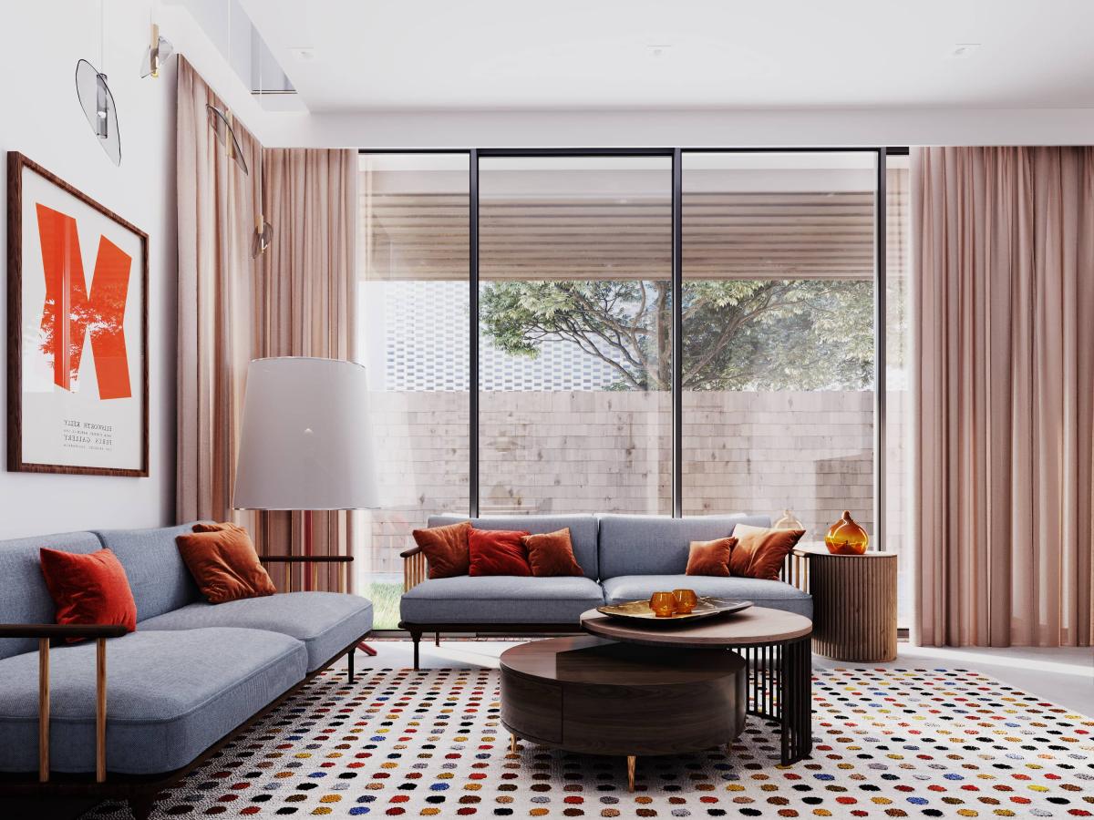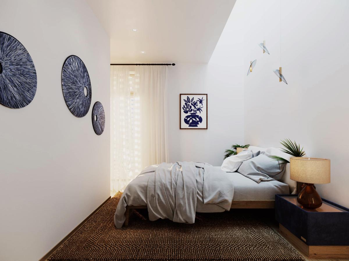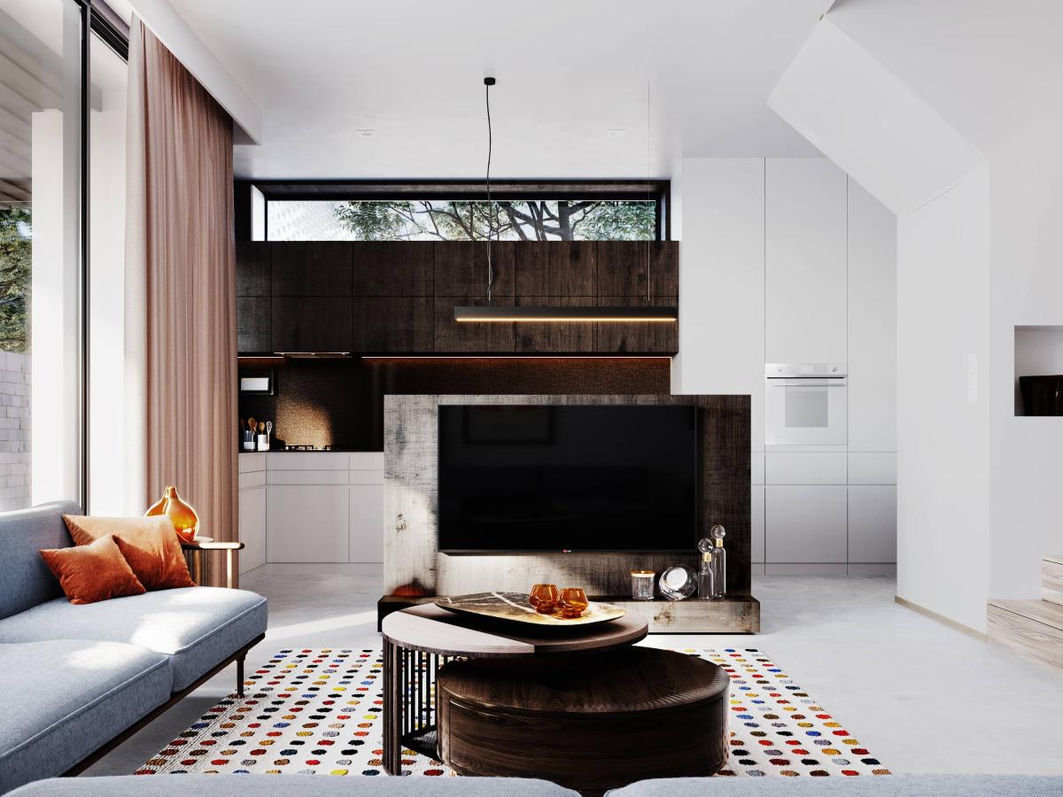 Projekt wnętrza w bardzo minimalistycznym stylu, neutralnych kolorach oraz materiałach. Jasne ściany są tłem dla całej aranżacji wnętrza oraz są idealną sceną dla wpadającego, naturalnego światła. Część wspólna wprowadza kolory do wnętrza za sprawą mebli i dodatków co nadaje jej przytulny, domowy klimat, zachęcający do wspólnego spędzania czasu.