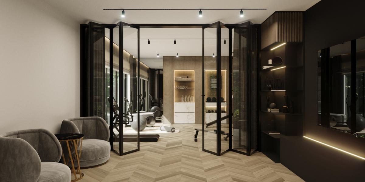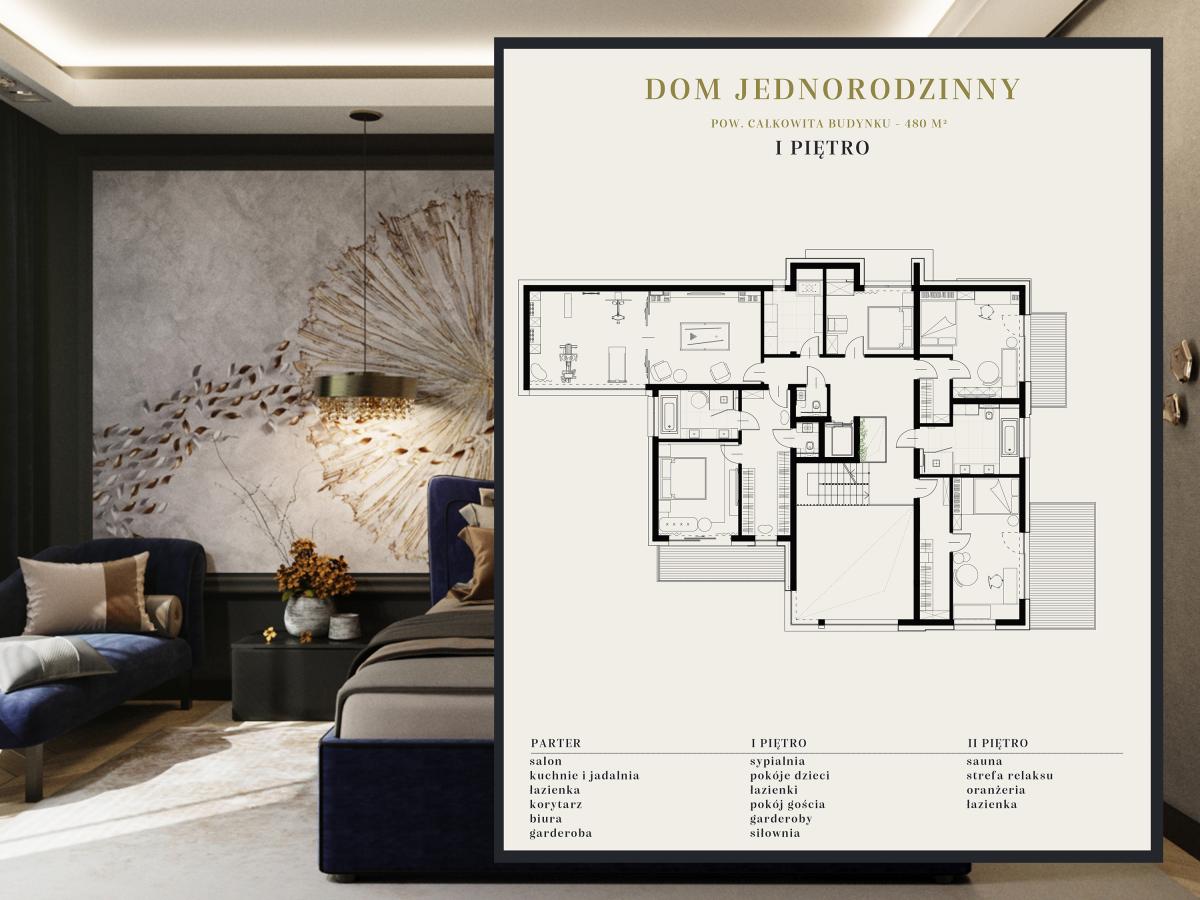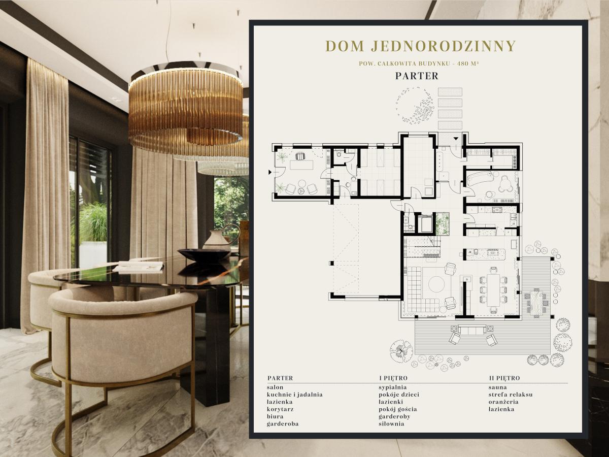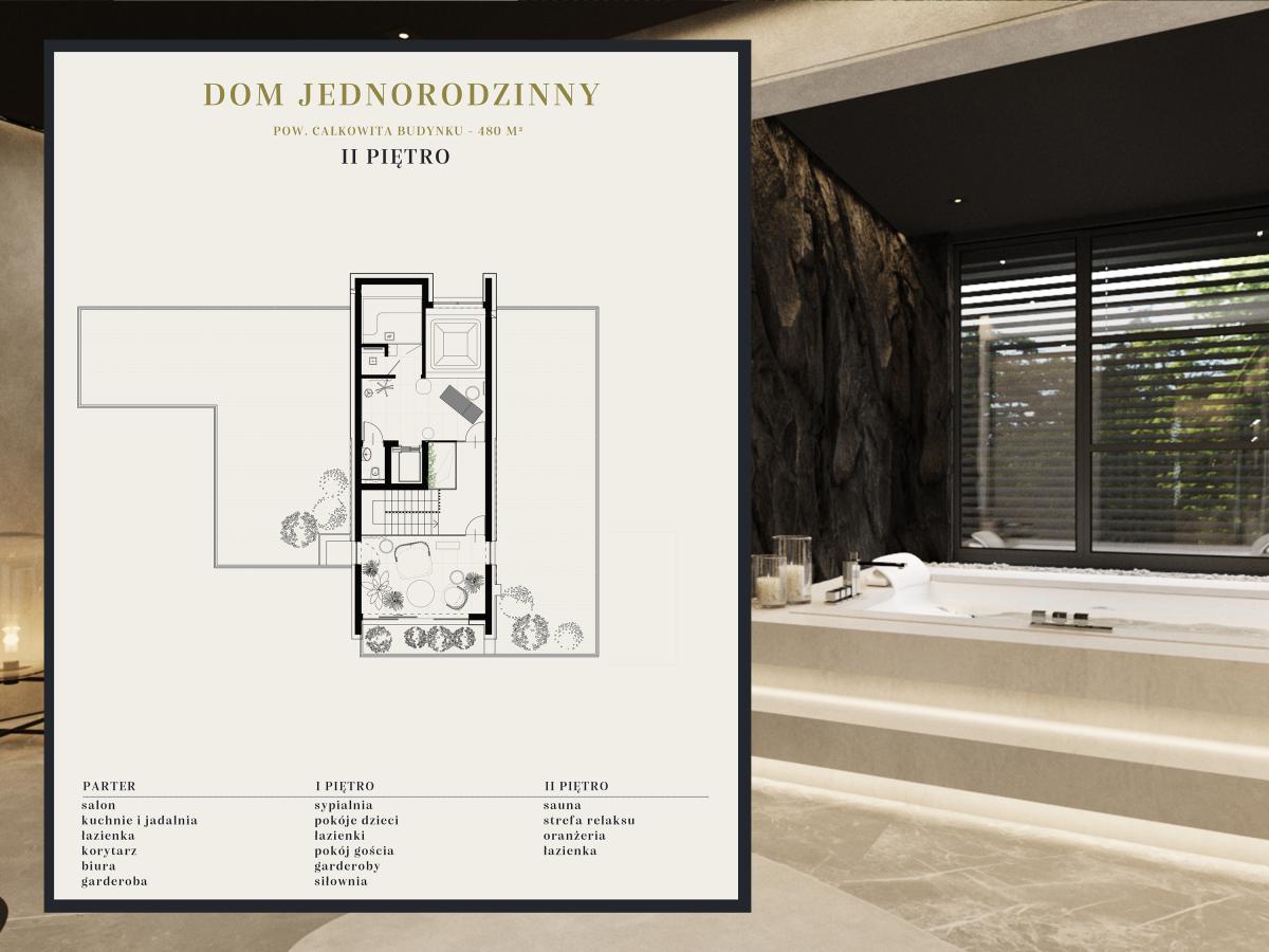 Rezydencja podzielona jest na trzy strefy: przestronny parter, który obejmuje duży salon z kominkiem oraz otwartą kuchnię, gdzie można cieszyć się wspólnym czasem, piętro z sypialniami oraz domową siłownią i strefą rozrywkową. Na najwyższym piętrze znajduje się strefa wypoczynkowa z oranżerią, która oferuje doskonałe naturalne nasłonecznienie w otoczeniu roślin. Dodatkowo, relaks można znaleźć w pomieszczeniu z jacuzzi oraz sauną, gdzie codzienne troski stają się odległym wspomnieniem.
