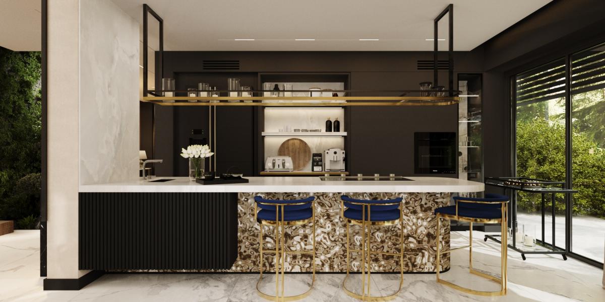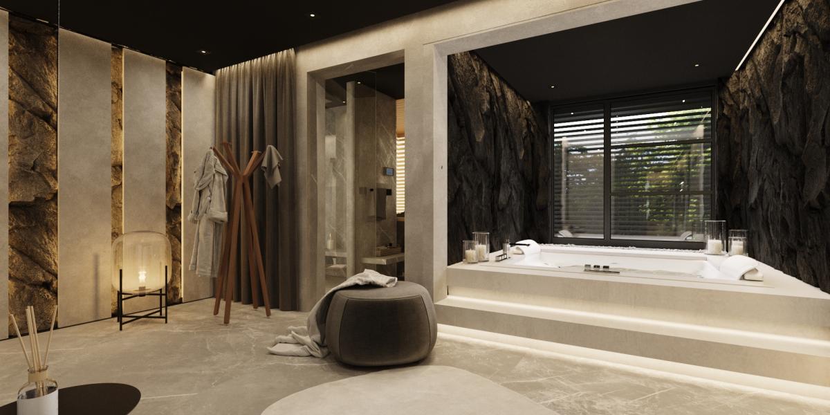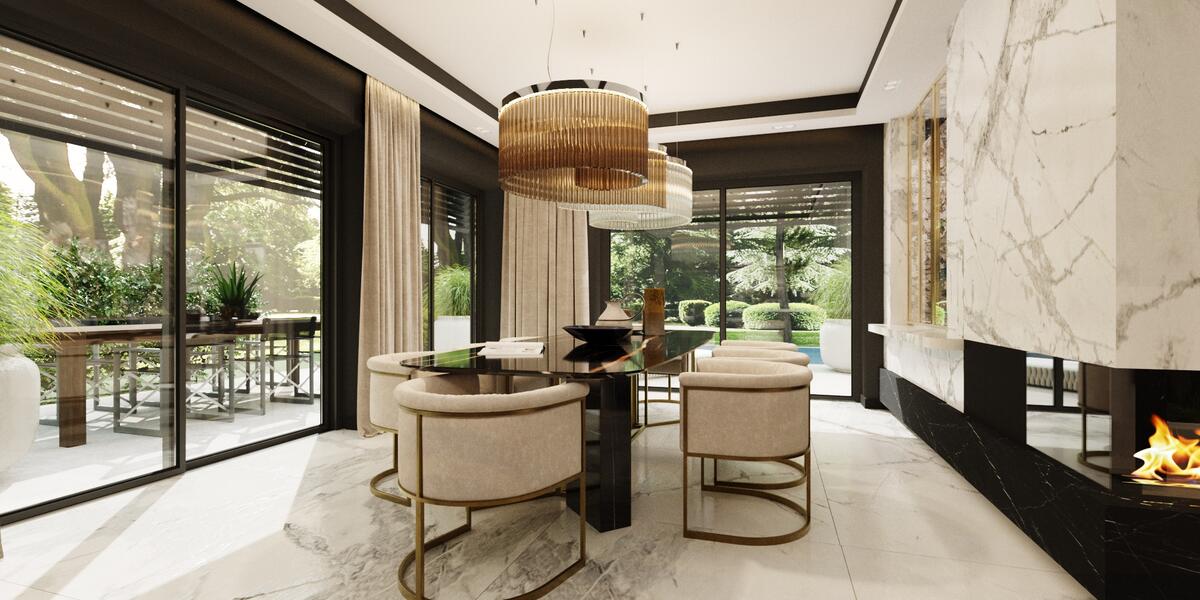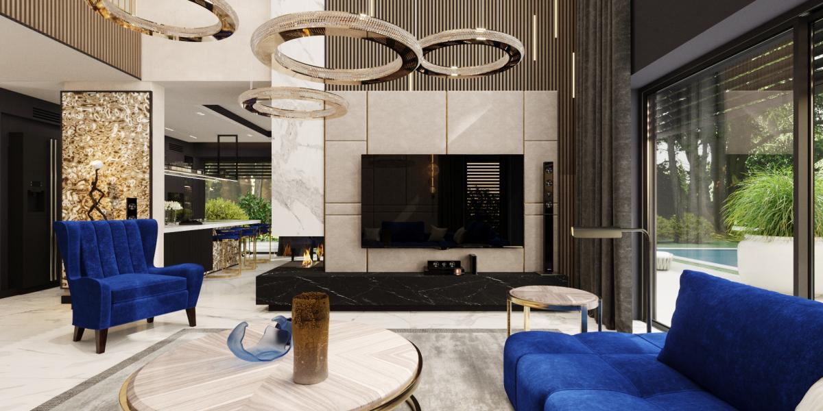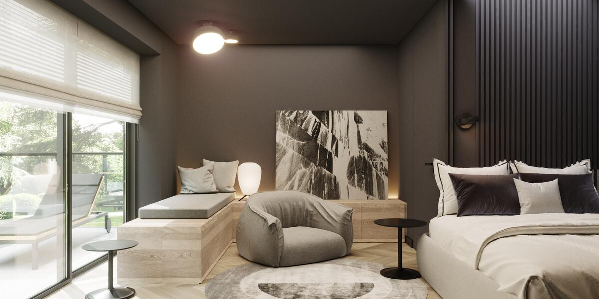 Rezydencja podzielona jest na trzy strefy: przestronny parter, który obejmuje duży salon z kominkiem oraz otwartą kuchnię, gdzie można cieszyć się wspólnym czasem, piętro z sypialniami oraz domową siłownią i strefą rozrywkową. Na najwyższym piętrze znajduje się strefa wypoczynkowa z oranżerią, która oferuje doskonałe naturalne nasłonecznienie w otoczeniu roślin. Dodatkowo, relaks można znaleźć w pomieszczeniu z jacuzzi oraz sauną, gdzie codzienne troski stają się odległym wspomnieniem.