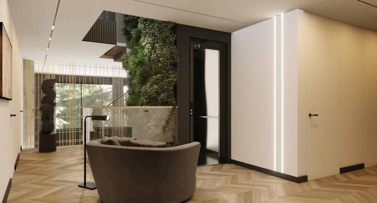 Projekt wnętrza charakteryzuje się wyrafinowaną elegancją i zastosowaniem naturalnych materiałów. Kilka mebli w odważnych kolorach doskonale uzupełnia nowoczesną aranżację, a zaprojektowana zielona ściana z żywych roślin, rozciągająca się przez wszystkie kondygnacje, harmonijnie łączy elegancję z naturą. Tworzy to komfortowe i niebanalne wnętrze, które spełniło oczekiwania bardzo wymagających klientów.